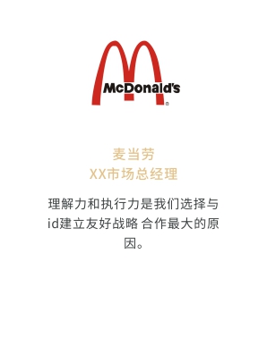 i-d先后經(jīng)歷與Audi、Mercedes-Benz、infiniti、PORSCHE、可口可樂、麥當(dāng)勞、肯德基、Budweiser、華為、小米、中國移動、ELLE、L'OREAL、萬達、仁恒置地、恒大、碧桂園、蘭桂坊...的業(yè)務(wù)合作,成功地將國際化的營銷策劃理念及執(zhí)行方式融入本土,為更多的中國企業(yè)開啟全新的品牌推廣思路和執(zhí)行方案。